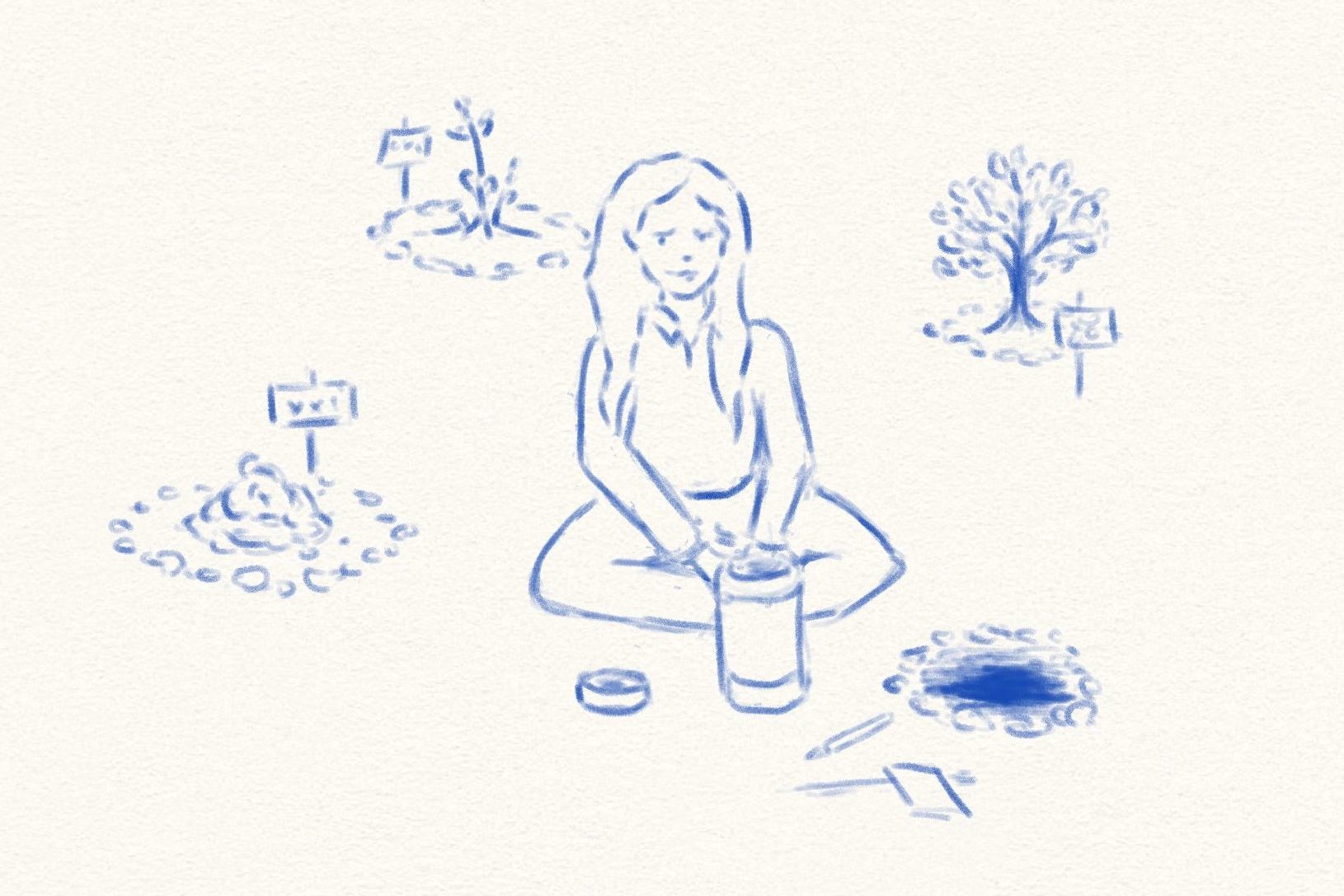 Cinema, to me, is a time capsule. With every exhibition of a film, you gather your neural connections, sense receptions, and engagement with the stimulus to be sealed within the film once the credits finish rolling. To watch a film is to unseal that time capsule, writing a new memory over while storing the original experience in a deeper pocket of your mind’s archive. I drew a garden; each plot represents an exhibition, and each flowering symbolizes the maturation of that experience. Revisiting a film is like digging up a time capsule, allowing you to remember who you once were, at the cost of diffusing that trace.